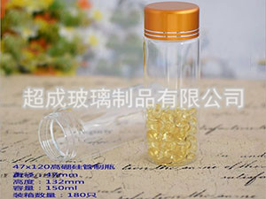此款規(guī)格為直徑44mm,口徑40mm,高度89mm,容量70ml。原材料采用優(yōu)質(zhì)高硼硅玻璃,制作工藝為管制??畈A恐饕糜诟邫n保健品,蟲草含片,瑪咖精片,鹿茸膠囊,參茸,山參片,蟲草粉,蜂膠,魚油,燕窩,海參等高檔奢飾品。